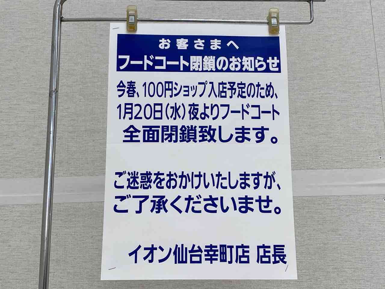 フードコートは、1月20日をもって全面閉鎖。